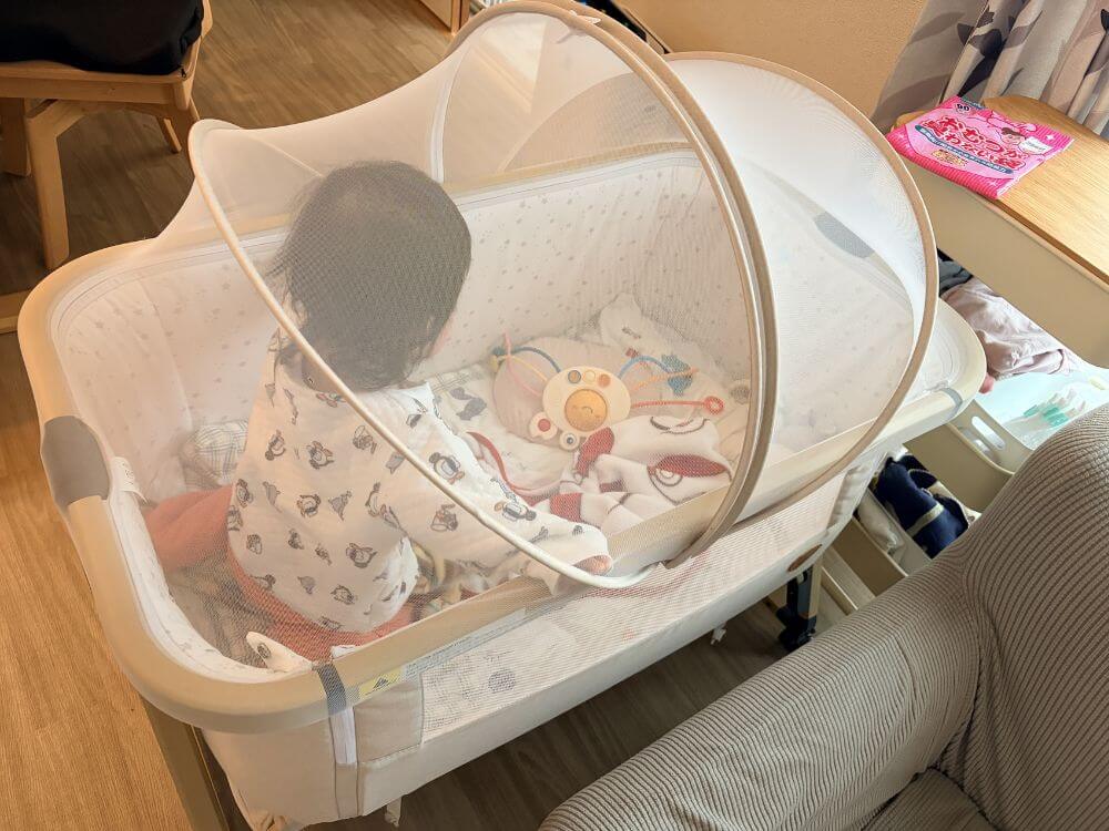 寝室にはよく見かける普通のベビーベッドを使用していますが、リビングはそこまで広くないので、コンパクトなものを探していました。