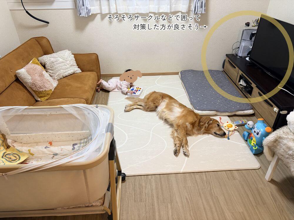 もし、広いリビングをお持ちの方や、赤ちゃんが動き回るようになったときに、愛犬とまだ信頼関係ができていないようでしたら物理的に距離が作れるサークルはあってもいいと思います。