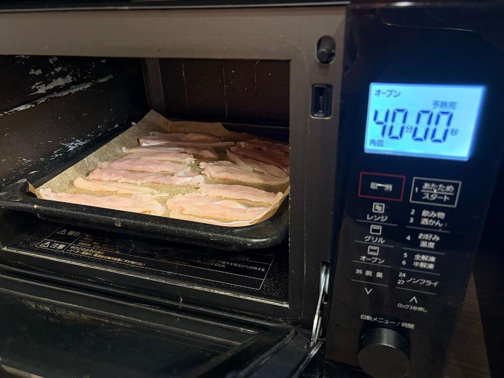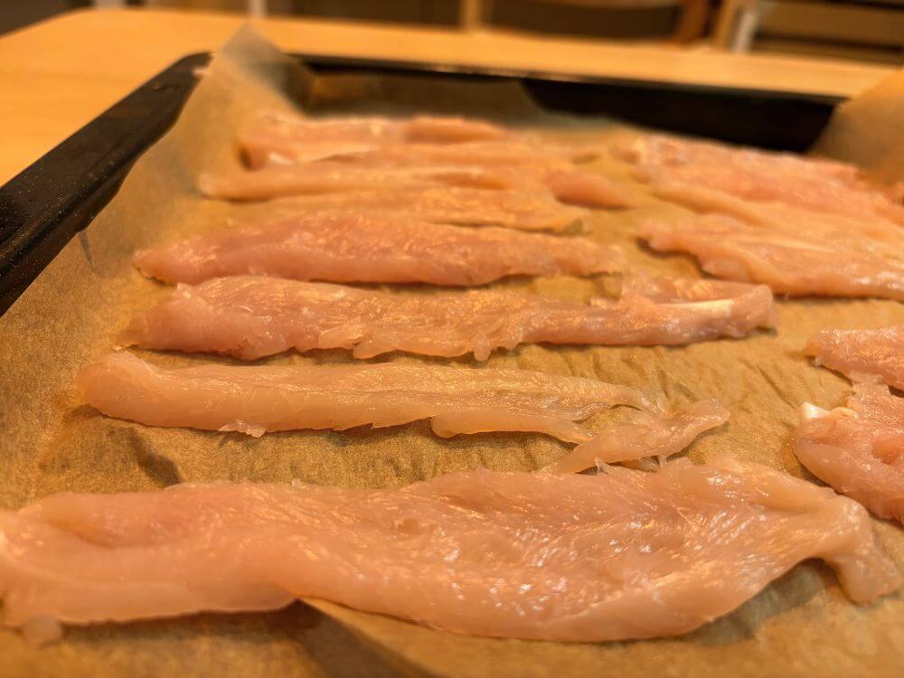 - 天板にクッキングシートを敷いて切ったササミを並べていく