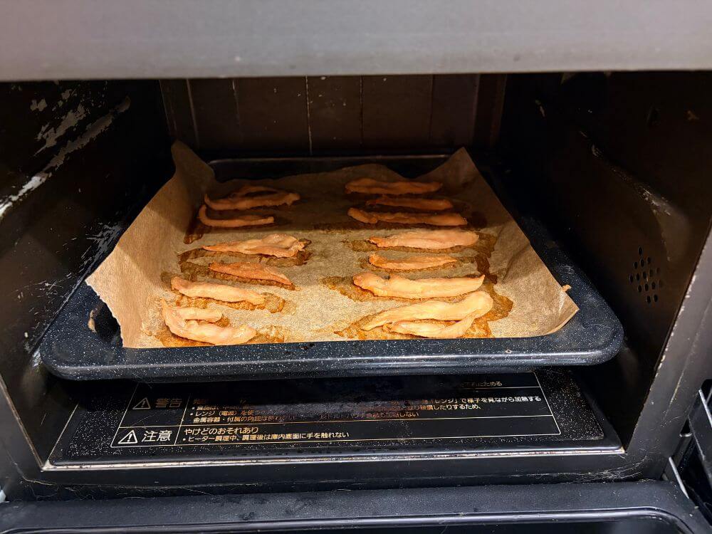 オーブンで加熱後は庫内でササミジャーキーが冷めるのを待ち、さわってみてカチカチ(水分が飛んでいる)状態になっていればササミジャーキーの完成です!