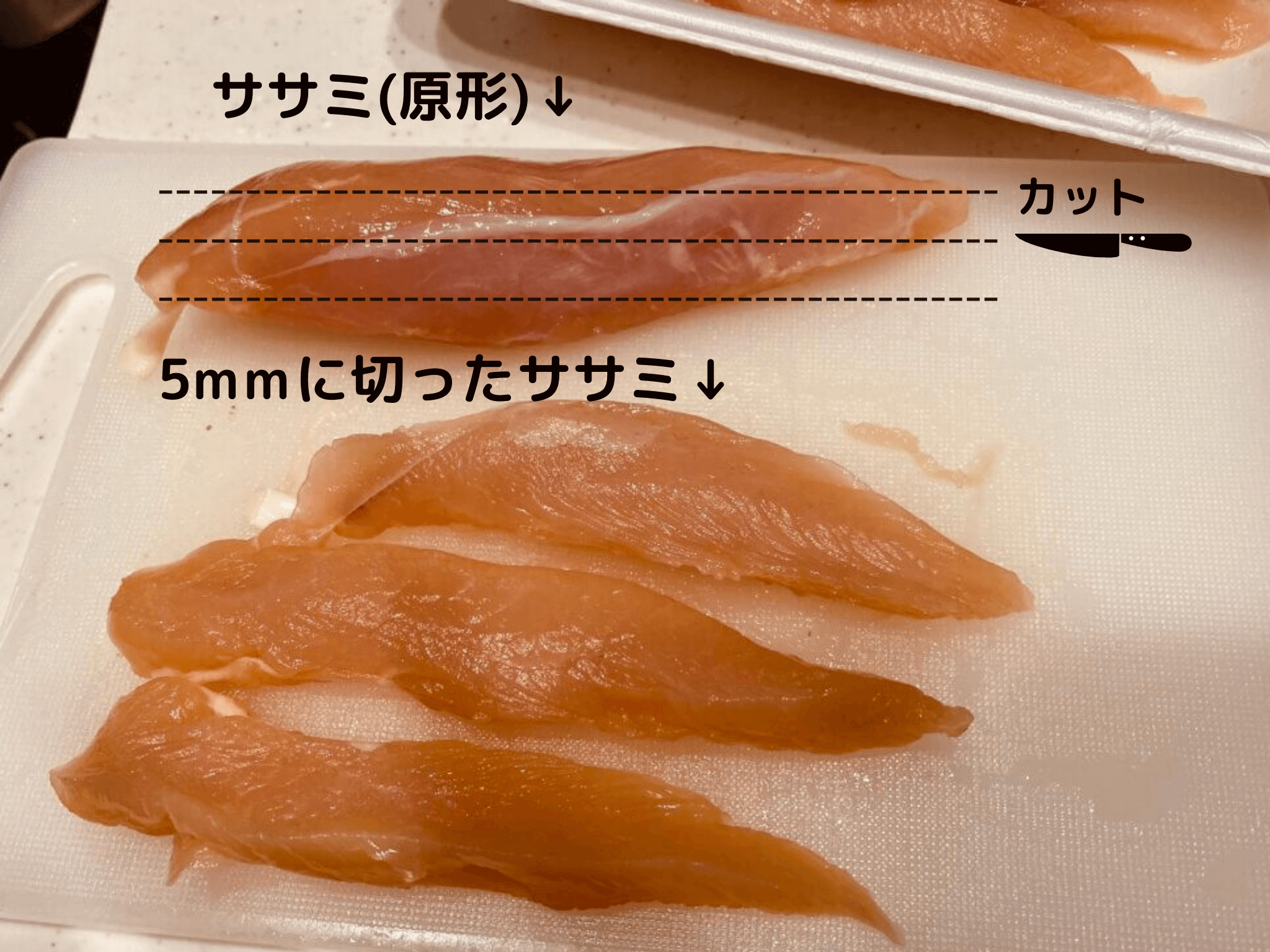 - ササミを包丁で5mmを目標に縦にスライスする